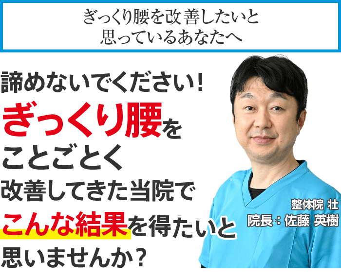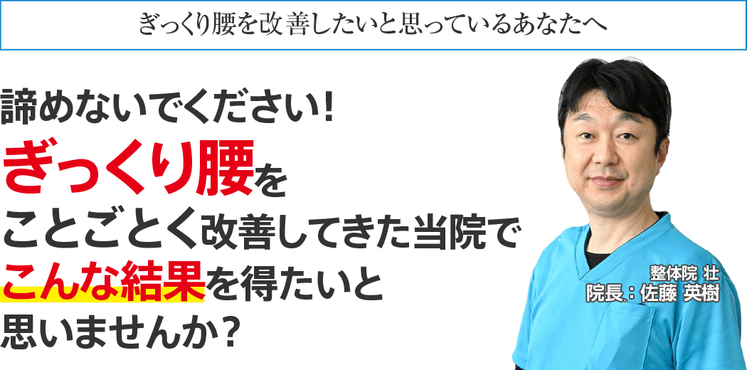 あなたは「改善結果のないぎっくり腰の施術」にいつまで貴重な時間と大切なお金を使いますか?あなたに、その辛い痛みでこの先ずっと悩み続けて欲しくはないのです。